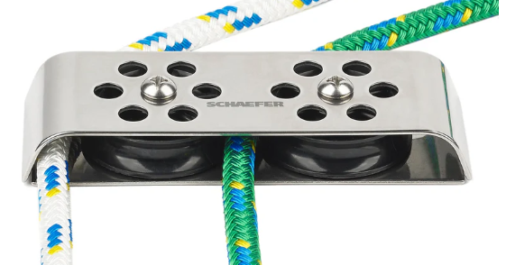 5 Series Double Stainless Steel deck organizer. Stainless Steel base and Stainless Steel top strap provide a high strength base. Delrin(tm) sheaves ensure smooth operation and high strength. Sheave Dia. 2" (51 mm), Max Line 7/16" (11 mm), L 5-5/32" (146 mm), W 2" (51 mm), H 13/16" (20 mm), Fasteners (2) 1/4" RH (6 mm), CC 2-1/4" (57 mm), SWL 1950 lbs. (885 kg), Weight Stain. 11.8 oz. (334 g), Weight Alum. 9.5 oz. (269 g)