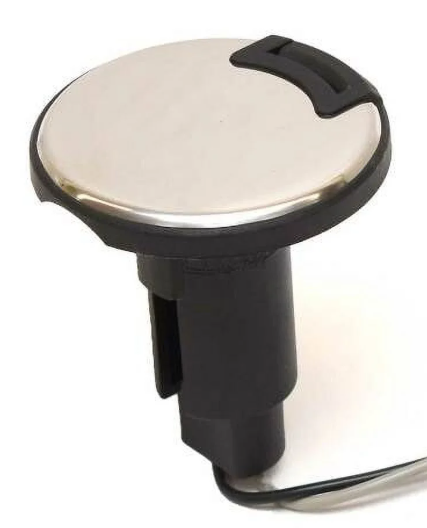 This light plug-in base is constructed out of black plastic and stainless steel.