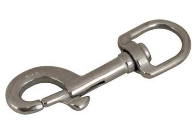 Swivel Eye Bolt Snaps are designed for use as tie-downs, or multiple rigging applications. 360° swivel strap eye reduces tangling. Spring-loaded bolts provide secure closure with the advantage of an easy-open thumb lever. Constructed of corrosion resistant investment cast 316 stainless steel.