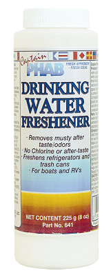 Le désodorisant pour eau potable Captain Phab élimine complètement les goûts de moisi, de moisissure, de plastique et d'antigel et ne laisse aucun arrière-goût détectable. Pour utilisation dans les systèmes d'eau chaude et froide utilisant des réservoirs en plastique, en fibre de verre ou en métal. Donne à l’eau stockée un goût pétillant, frais et propre. Ne contient pas de chlore. 8 onces 225g.