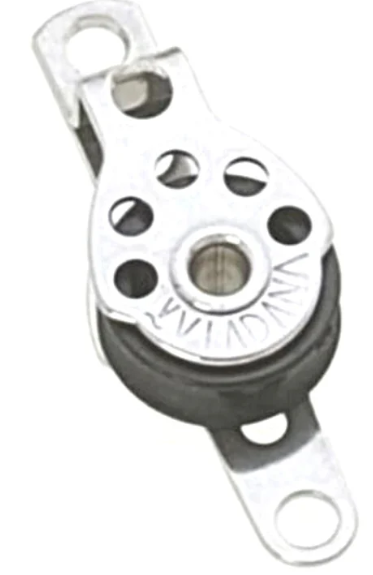 Diamètre de la poulie : 17 mm Diamètre maximal du cordage : 5 mm Hauteur totale : 29 mm Poids : 5 grammes Charge de rupture : 300 kg Diamètre du trou : 5/32 po Espacement des trous : 1 37/64 po