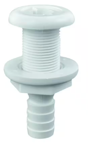 The Attwood Thru-Hull Connector accommodates a 5/8 in. bailer plug and is designed for installation above the water line. It is white and made of durable polypropylene.