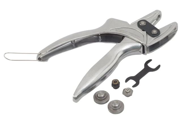 L'outil d'accrochage pour toile est conçu pour installer le capuchon (dôme) du bouton-pression directement sur la toile ou sur l'œillet, à l'aide de l'un des deux ensembles de goujons en toile et de matrices à douille inclus avec l'outil.