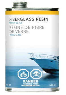Résine de fibre de verre pour applications marines et automobiles, avec cire. Sèche complètement une fois durci.
