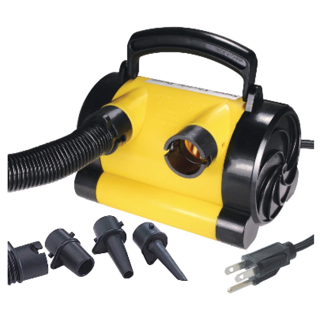 Cette pompe à air de 120 volts se gonfle et se dégonfle rapidement et efficacement. La pression maximale est de 2,5 psi, ce qui signifie qu'il y a suffisamment de force pour remplir des bateaux gonflables haut de gamme, des radeaux, des tubes remorquables, des flotteurs de piscine et bien plus encore.