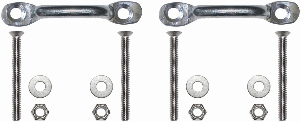 Ce kit de quincaillerie en acier inoxydable contient : * 2 boucles de pied en acier inoxydable. *4x3/16x1-3/4 boulons Phillips à tête plate en acier inoxydable * 4x rondelles S/S *4x contre-écrous