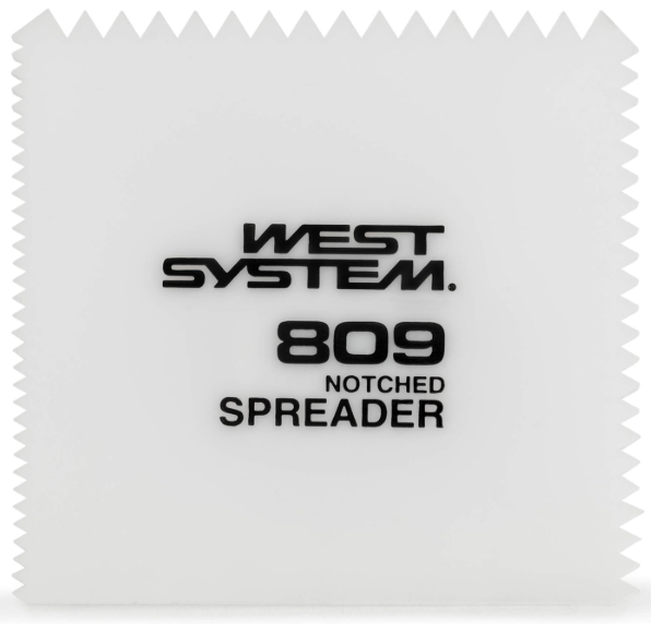 Cet épandeur en plastique rigide de 4″ x 4″ avec des encoches de 1/8″, 3/16″ et 1/4″ sur trois côtés permet d'appliquer rapidement de l'époxy épaissi à un rythme constant sur de grandes surfaces.
