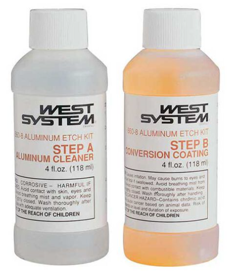 A two-part treatment to prepare aluminum surfaces for bonding with epoxy. Significantly improves adhesion. Two 4oz. bottles.