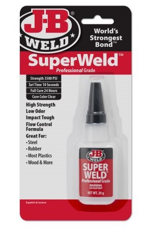 SuperWeld™ est une super colle cyanoacrylate spécialement formulée qui fournit une liaison forte et instantanée en quelques secondes seulement. Il fonctionne sur des surfaces multiples et difficiles à coller. Résistance – Temps de prise de 3 500 PSI – Temps de durcissement de 1 minute – Couleur de durcissement de 24 heures – Utilisation claire sur – Automobile, plastique/composite/PVC, bois, métal et plus encore.