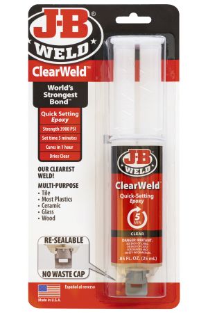 Un époxy à deux composants polyvalent à prise rapide qui fournit une adhérence solide et durable sur la plupart des surfaces, y compris le carrelage, la plupart des plastiques, la céramique, le verre, le bois et le métal. ClearWeld™ est conçu pour durcir avec une liaison claire et transparente lorsqu'il est utilisé à des épaisseurs inférieures à 15 mil. ClearWeld™ a un rapport de mélange de 1:1, prend en 5 minutes et durcit en 1 heure. Avec une résistance à la traction de 3 900 PSI, ClearWeld™ forme une liaison dure et permanente. Utilisation sur : automobile, brique, céramique, tissu/tapis, béton, fibre de verre, verre, plastique/composite/PV, et plus encore. Résistance – 3900 PSI Temps de prise – 5 minutes Temps de durcissement – 1 heure Couleur de durcissement – Transparent